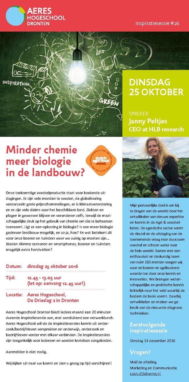 Minder chemie/meer biologie in de landbouw? Welke oplossingen kan biologie bieden in tijden van globalisering en klimaatverandering? Dat is waar Janny Peltjes, CEO bij HLB research, over zal spreken. De toegang is gratis en aanmelden is niet nodig. We zien je graag op 25 oktober in Dronten!