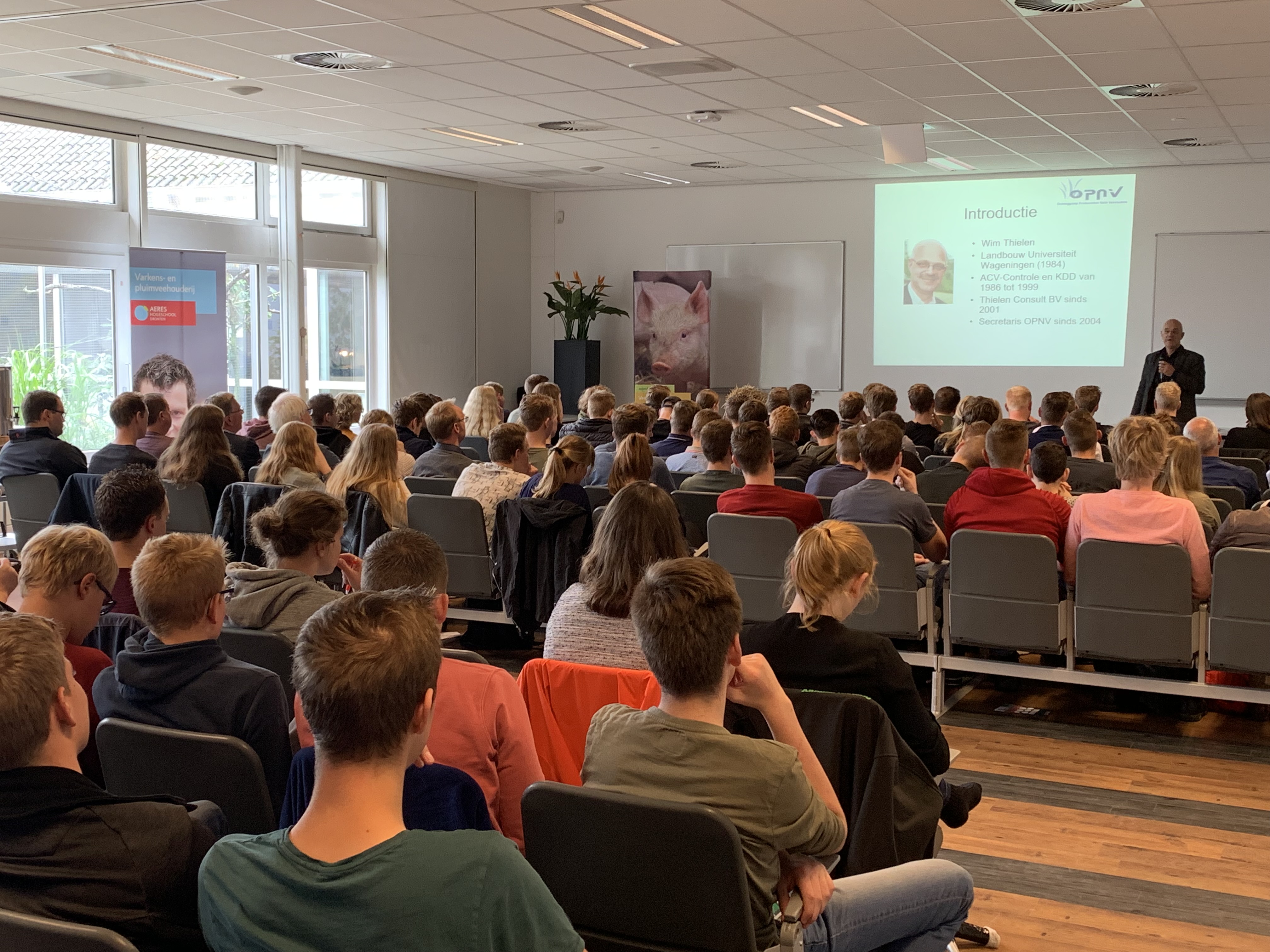 Kees Maas, directeur van DCA Marketconsultancy & Risk Management, ging in op het belang van risicomanagement en de wijze waarop de ondernemer riscio’s beleeft. Hij deed dat met een persoonlijk verhaal. ‘De grootste belemmering als ondernemer is je vader’ durfde Maas te uiten. Hij ging in op verschillende typen risico’s: persoonlijk, productie, prijs, financiering en politiek. De boodschap van Maas aan het publiek: kansen moet je zien en pakken en bedreigingen moet je managen. Via drie stellingen en vijf quizvragen gingFrank van Lohuijzen van Abeos, ondersteund door zijn collega Gerrit Assink, in op het werk op een varkensbedrijf. Van Lohuijzen vroeg zich bovendien af waar de studenten waren op 1 oktober 2019 (boerenprotesten in het kader van Agractie). Ongeveer een derde van de studenten bleek naar het Malieveld in Den Haag te zijn gegaan.