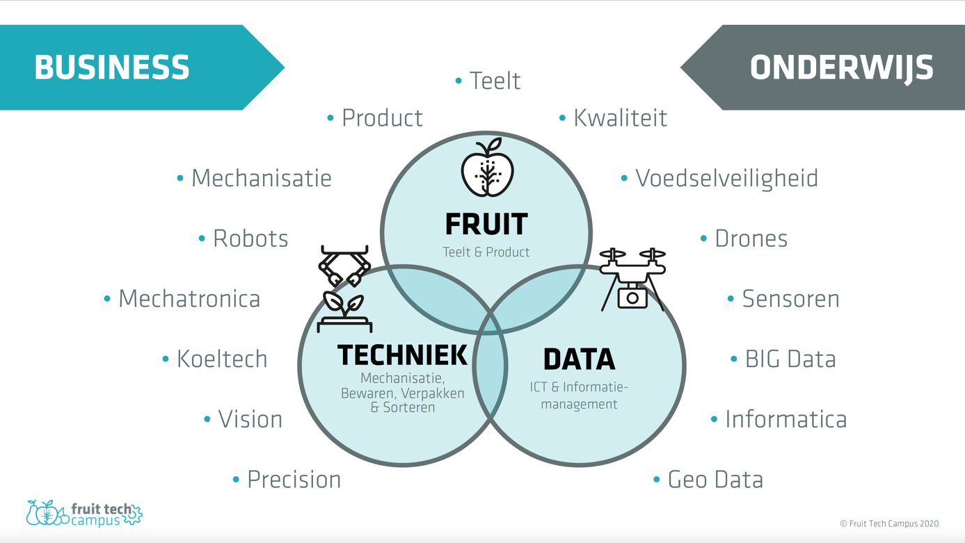 In de Fruit Tech Campus gaan Helicon MBO Geldermalsen, met zijn teeltopleiding, en Aeres MBO/HBO met agritechniek-profiel gezamenlijk de uitdaging aan om het onderwijs voor de fruitsector van de toekomst op te pakken. Stap één is dit op korte termijn vorm te geven in de vernieuwde teeltopleiding op mbo-niveau. Dit in een vorm die beter lijkt aan te sluiten bij de markt, waarbij BBL-studenten een week naar school gaan en vervolgens 4 weken aansluitend op het stagebedrijf werken. Deze verdeling van werken en leren is beter voor de leerprestatie in de week dat de studenten intern zijn en is tevens efficiënter qua reistijd voor studenten die verder weg wonen. Ook worden geheel nieuwe opleidingen ontwikkeld en gestart, onder andere gericht op sorteren en verpakken. Bij deze onderwijsvernieuwing is inzet en kennis van het bedrijfleven, zoals dat al in vele andere agri-sectoren gebeurt, cruciaal.