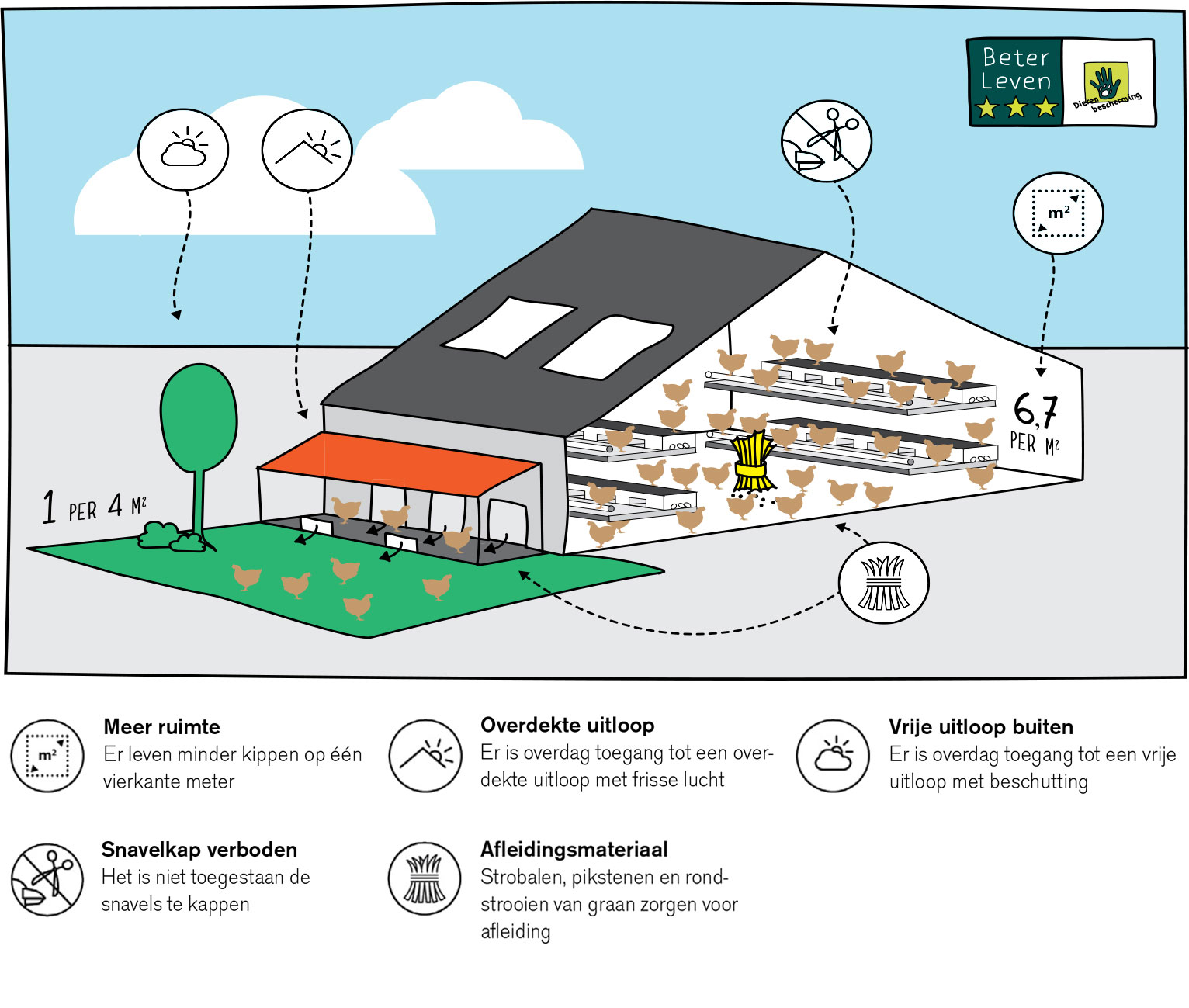 Het Beter Leven keurmerk is een initiatief van de Dierenbescherming. Kippen die gehouden worden in Beter Leven stallen hebben meer ruimte, afleidingsmateriaal en mogelijkheden om zich op een natuurlijk wijze te gedragen. Met drie sterren staat de stal gelijk aan biologisch of is deze net zo diervriendelijk. Er zijn maximaal 6,7 hennen per m2. Ze hebben een overdekte en een vrije uitloop naar buiten en de groepsgrootte bedraagt maximaal 6.000 hennen. In de gangbare pluimveehouderij geldt geen maximum groepsgrootte. De Aeres-stal heeft een vrije uitloop die een bosrand nabootst. Daarvoor gebruikt Aeres coniferen. Er komt veel daglicht binnen in het overdekte deel en het dak daarvan kan open. Snavelkap is in een driesterren-stal verboden. Het afleidingsmateriaal, meer bewegingsvrijheid, frisse lucht in de vrije uitloop en een natuurlijk dag- en nachtritme moet verenpikken voorkomen. Het meer natuurlijke gedrag dat de dieren in deze stal kunnen vertonen, moet ertoe leiden dat er minder dieren ziek worden.