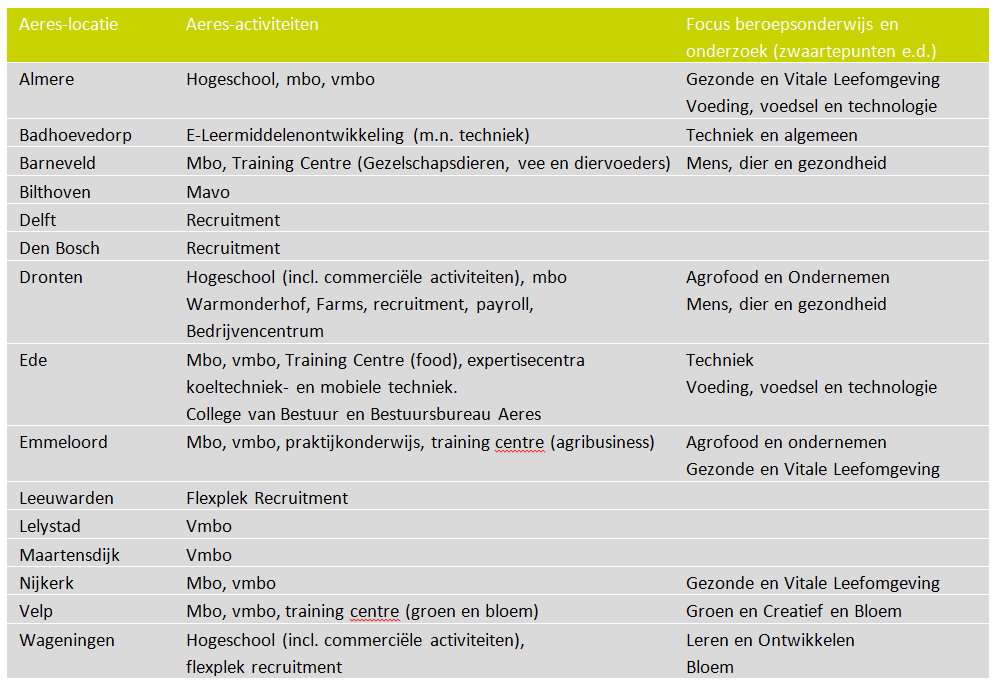 De veertien werklocaties van Aeres hebben ieder hun eigen grondslag, activiteiten en profilering. De profilering is voor een deel gekoppeld aan de zwaartepunten van Aeres. Deze zwaartepunten bepalen de focus van het beroepsonderwijs en het onderzoek. Daarnaast zijn er nog twee flexplekken,